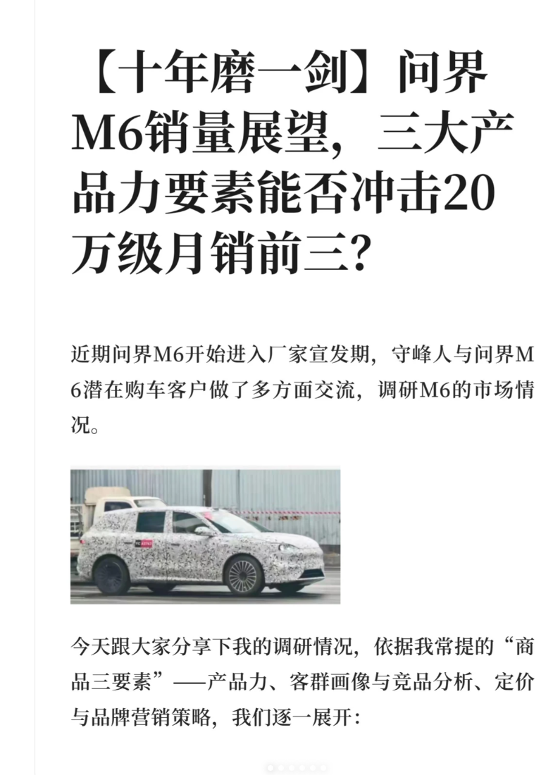 网友们对问界M6的期待值早已拉满:“华为智驾+800km续航,这配置在20万级太能打了”“23.88万的起售价诚意十足,坐等上市”“问界的品牌和口碑摆在这里,月销破2万应该不难”。结合产品力、品牌力与定价优势,问界M6冲击20-30万级SUV月销前三、实现月销2万辆+的目标,无疑具备极大的可能性。